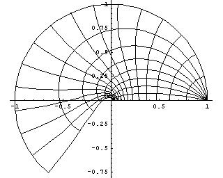 << Graphics`ComplexMap` In[2]:= pm = PolarMap[Exp, {0, 4, 1/4}, {Pi/2, Pi, Pi/16}]; In[3]:= JavaView[pm] |